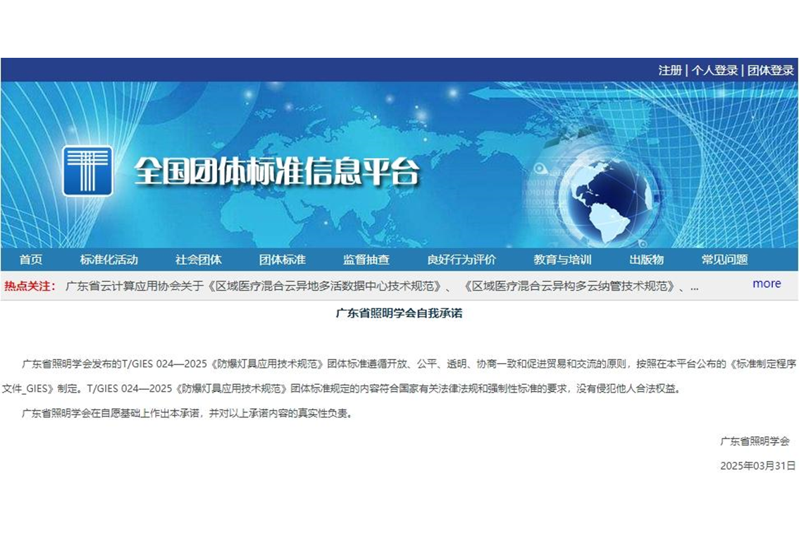 据全国团体标准信息平台官网消息,广东省照明学会近期正式发布了T/GIES 024—2025《防爆灯具应用技术规范》团体标准。自发布之日起,该标准正式实施。